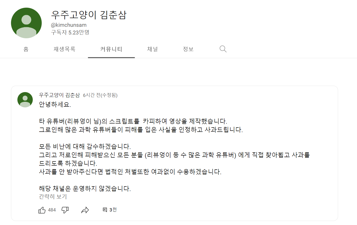 저격영상의 주인공인 우주고양이 김춘삼 유튜브 채널도 모든 영상을 내리고 사과문만 남겼습니다.